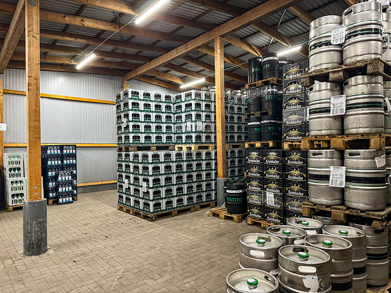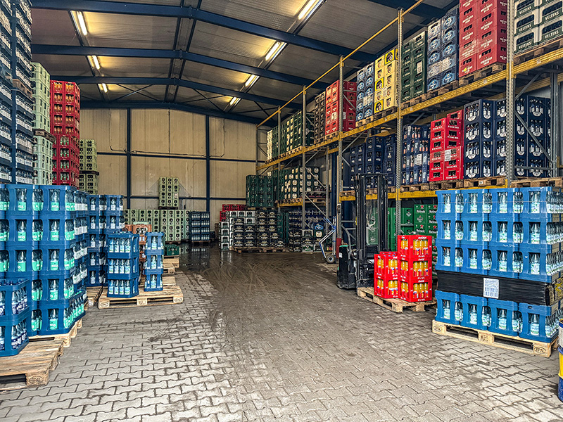 Das Betriebsgelände wurde kontinuierlich erweitert: Ein modernes Hochregallager, neue Hallen, Kommissionierflächen und Leergutbereiche sorgen für effiziente Abläufe. Auch der Fuhrpark wuchs: Sechs LKW, ein großer Fernzug und ein Bulli gewährleisten tägliche Belieferung und flexible Kundenbetreuung.